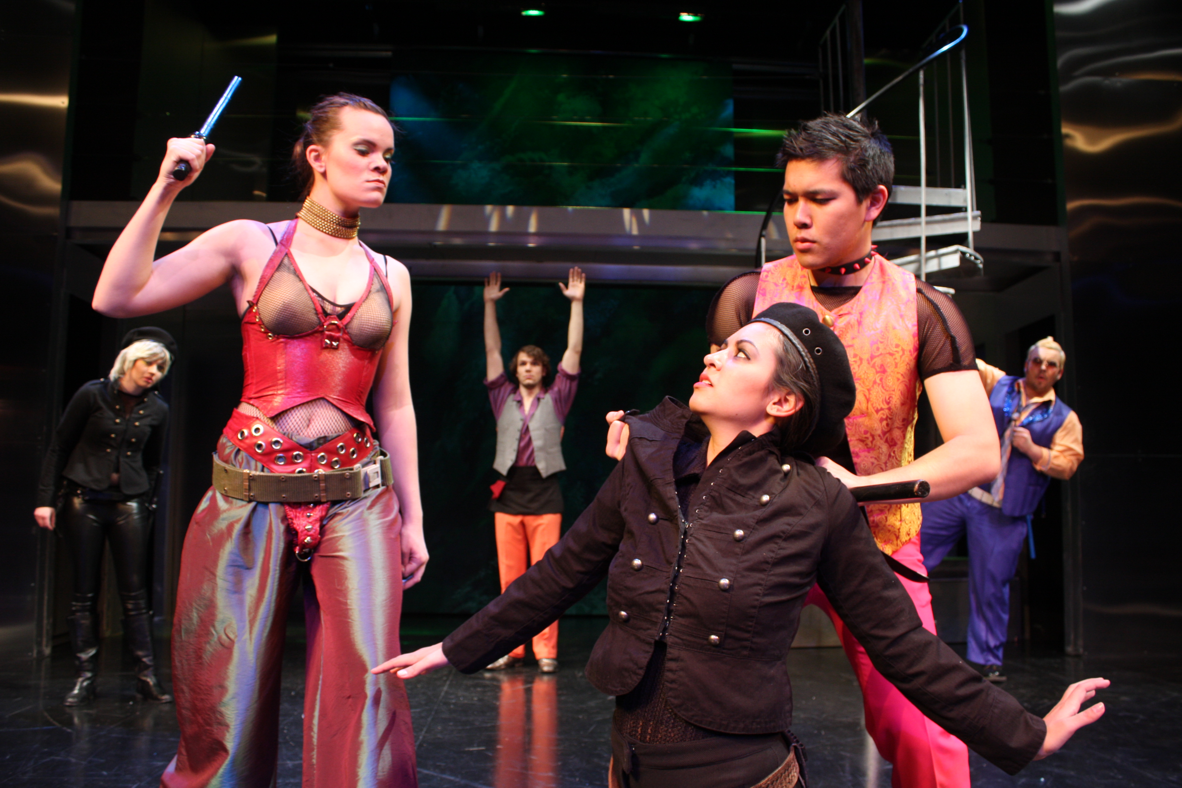 Photo of Twelfth Night at the University of California at Riverside, Directed by Holly L. Derr. FROM LEFT: Vesta Rounsaville, Alexandra Franke, Samantha Spada, Kyle Filippelli, Fracis Chen and Andrew Mena. Photo by Alan Call.