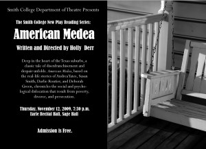 In August of 2011 I directed a semi-staged reading of my play American Medea at the Warner Loughlin Studios. American Medea creates a post-modern collage of the real-life stories of Andrea Yates, Darlie Routier, Deborah Green, and Susan Smith and the structure and characters of Euripides’ play to elucidate the cultural construction that is modern motherhood